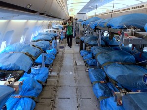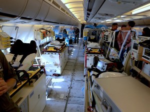 Wenn man im Innenraum nach oben schaut, sieht alles ganz normal aus – nur befinden sich in den Gepäckfächern keine Koffer, sondern Tonnen von medizinischem Material. Auch sonst ist alles anders. Es gibt wenige Sitzplätze – für ca. 25 Ärzte. Der Rest kann je nach Konfiguration über 50 liegende Patienten beherbergen, davon sechs mit Intensivbetreuung, für 10 Stunden in der Luft. Der ganze Innenausbau wurde so, wie wir ihn heute sehen, vor 5 Jahren konzipiert. Seitdem hat jedes einzelne Instrument einen monatelangen Prüfprozess zur Erreichung der Airworthiness durchlaufen. Und jedes Mal, bei Neueinbau oder Entfernung eines Elements: same procedure.