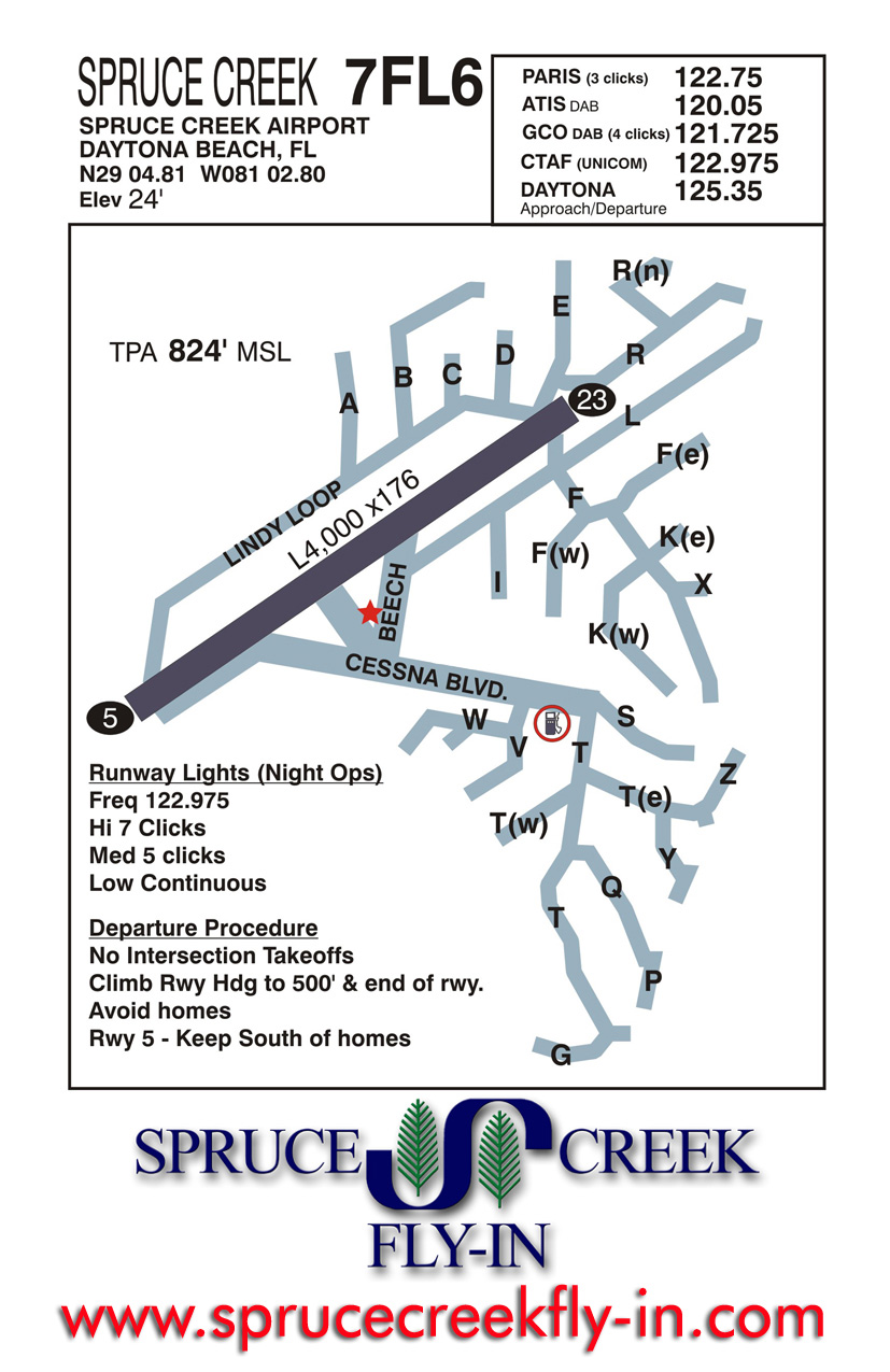 Spruce Creek Website, Anflugblätter, zahlreiche Infos zum Fliegen, Events, Wohnen hier: http://www.7fl6.com.