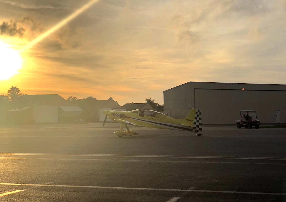 Jetzt macht uns eine gelbe Piper Cup Freude, startet in die Gegenrichtung und hebt nach gefühlten 10 Metern ab. Auch hier ein paar Touch and Go’s. Der Resident, der den Traffic aus seinem Caddy beobachtet, kommt vom 18-Loch Golfplatz des Geländes, hat seine Golfschläger geladen und hört den Funk mit. Er erzählt uns, dass der Traffic unter 1200 Fuß bleiben muss, weil der Daytona Airport in direkter Nachbarschaft liegt. Auch der New Smyrna Beach Municipal Airport ist nah, da darf sich der ganze Traffic nicht in die Quere kommen. Aber, sagt der Resident, „we are good friends“. Man arrangiert sich.