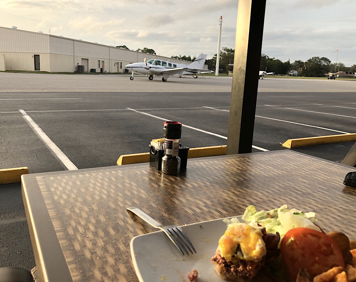Wir essen einen fantasischen Hangar Burger und sprechen über John Travolta, der hier auch mal Resident war, bis seine Flugzeuge der Community zu groß wurden. Ein brauner Porsche GT3 röhrt vorbei und parkt in einem halbgeöffneten Hangar neben einem weißen Porsche.