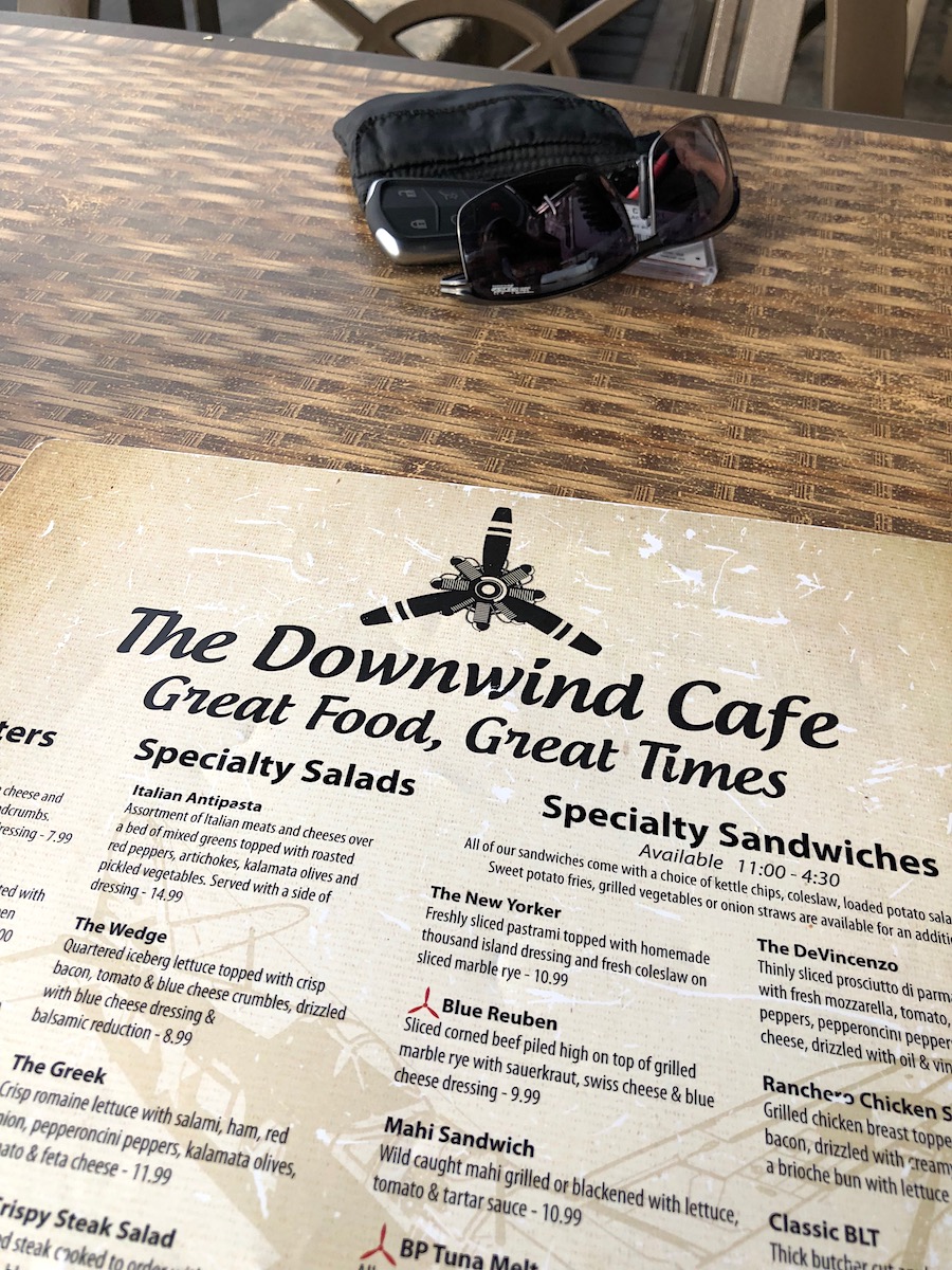 Am Sonntag fahren wir hin. Downwind Café steht im Navi, 100 Cessna Boulevard. Wir bekommen ein Guest-Entry Schein, mit dem wir nur auf direktem Wege zum Café fahren dürfen, Sightseeing per Auto durch das Gelände ist nicht gestattet und auch gar nicht so einfach: die meisten Straßen in dieser „Fly-In Community“ sind nämlich keine Straßen, sondern schmale Taxiways mit einer gelben Centerline. No cars allowed!